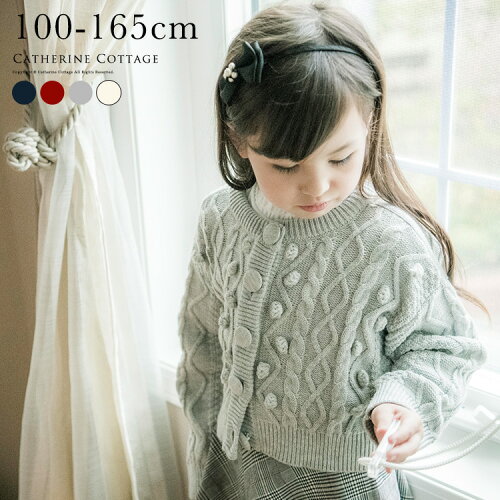 ニット カーディガン 女の子 ケーブル編みニットポンポンカーディガン[ 長袖 冬 100 110 120 130 140 150 160 165 cm 洗濯可能 洗えるニット 赤 紺 ネイビー 白 グレー アクリル 長袖 キッズ ジュニア ] キャサリンコテージ TAK